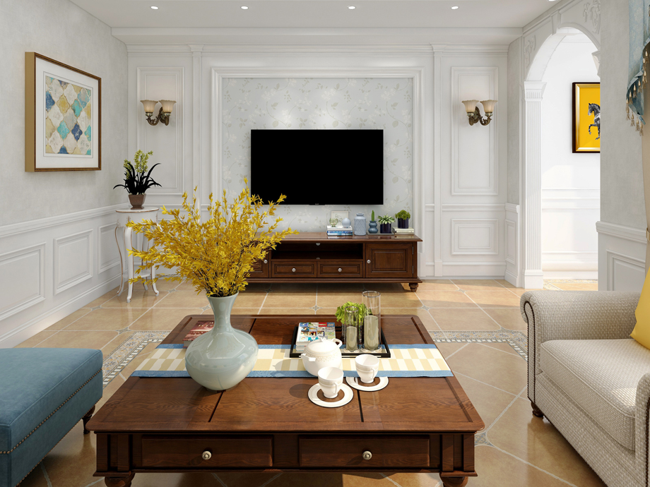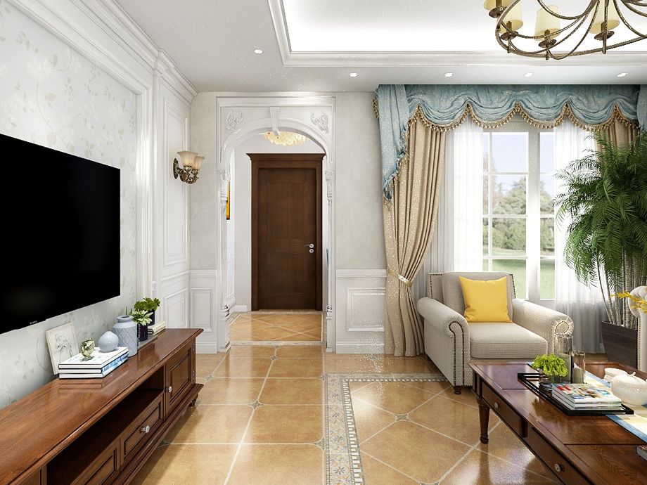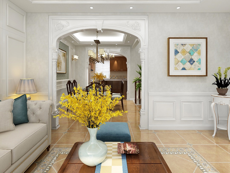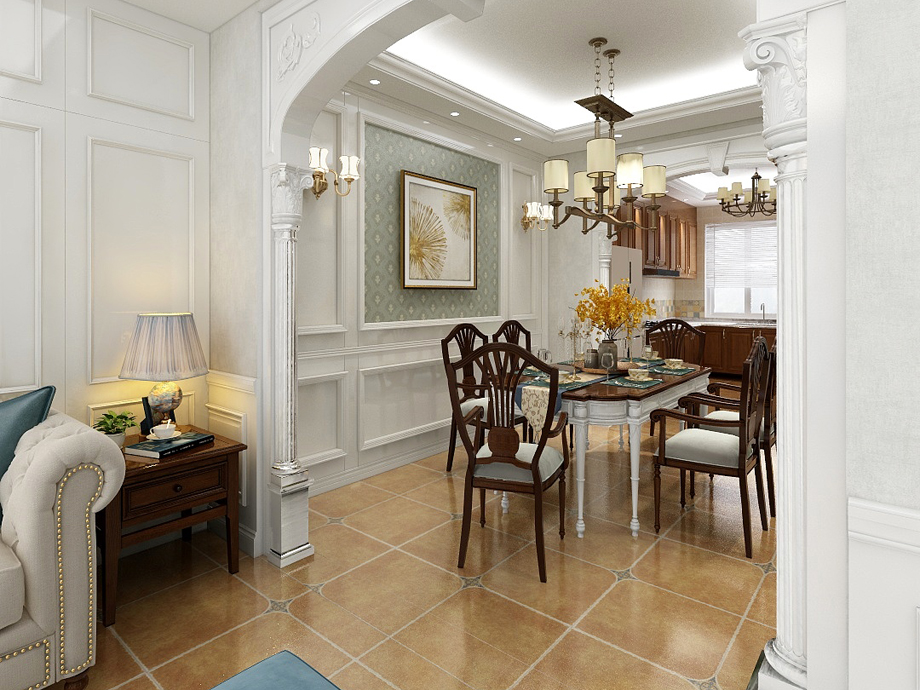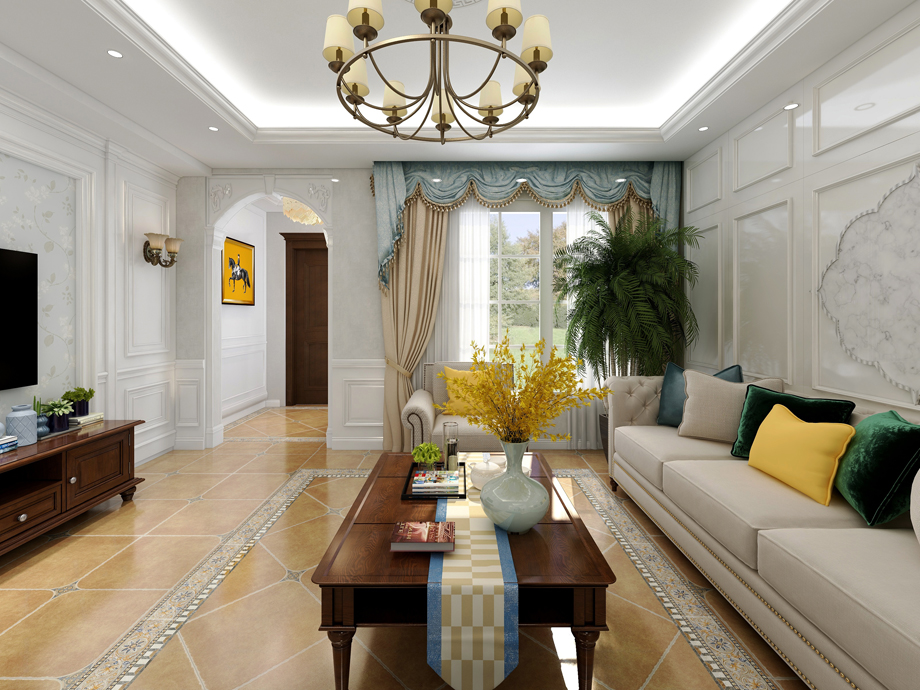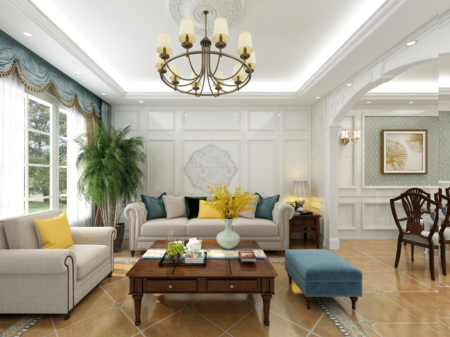 客廳作為待客區(qū)域,一般要求簡(jiǎn)潔明快,同時(shí)裝修較其它空間要更明快光鮮,通常使用大量的石材和木飾面裝飾;美國(guó)人喜歡有歷史感的東西,這不僅反映在軟裝擺件上對(duì)仿古藝術(shù)品的喜愛(ài),同時(shí)也反映在裝修上對(duì)各種仿古墻地磚、石材的偏愛(ài)和對(duì)各種仿舊工藝的追求上??傮w而言,美式田園風(fēng)格的客廳是寬敞而富有歷史氣息的。
