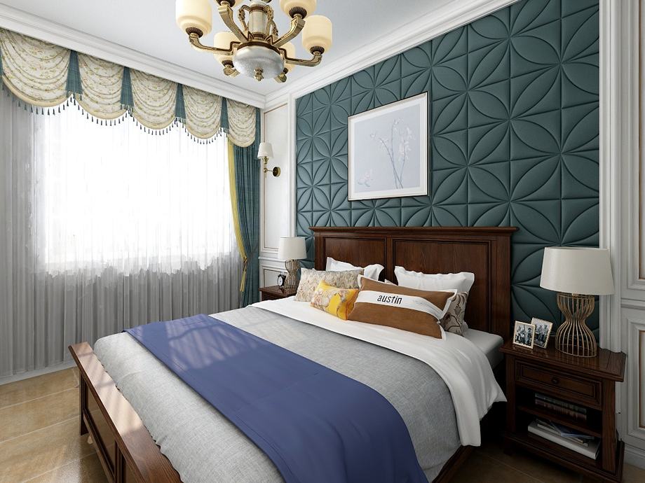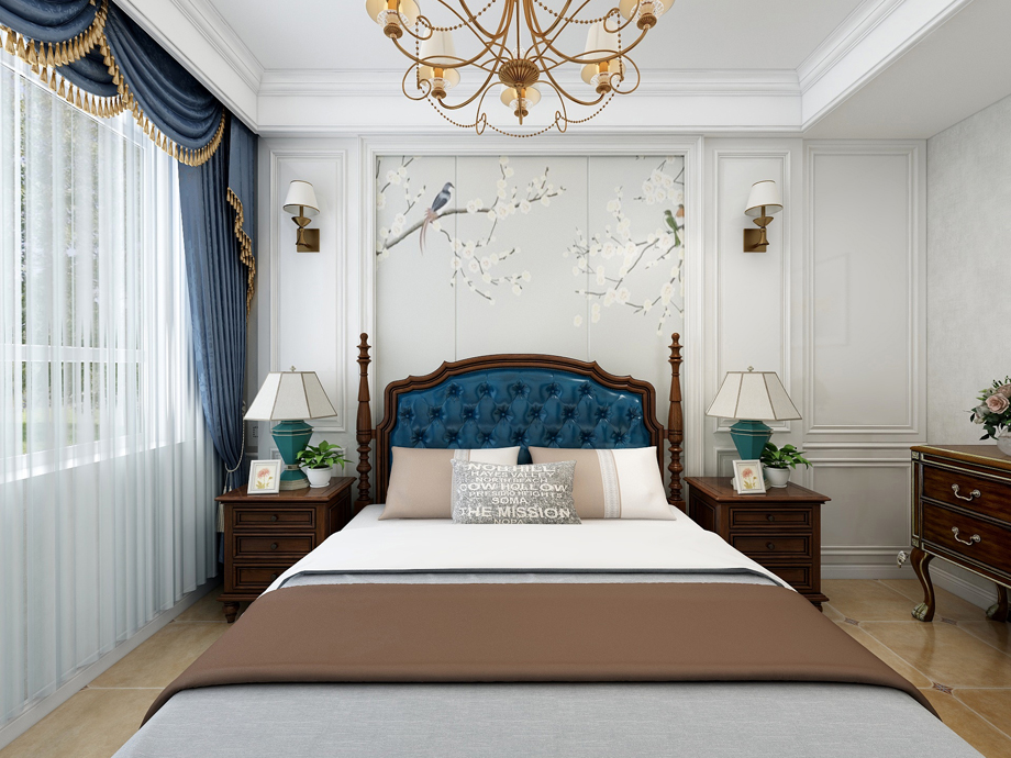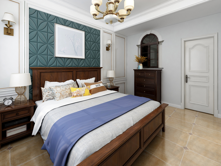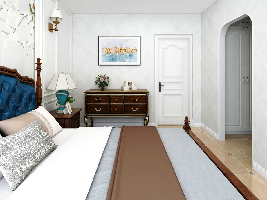 美式家居的臥室布置較為溫馨,作為主人的私密空間,主要以功能性和實(shí)用舒適為考慮的重點(diǎn),一般的臥室不設(shè)頂燈,多用溫馨柔軟的成套布藝來(lái)裝點(diǎn),同時(shí)在軟裝和用色上統(tǒng)一。